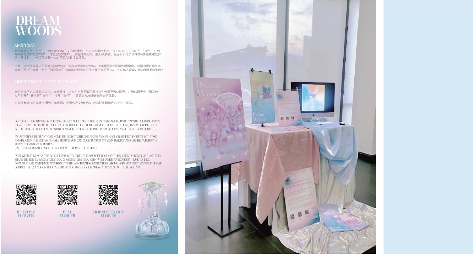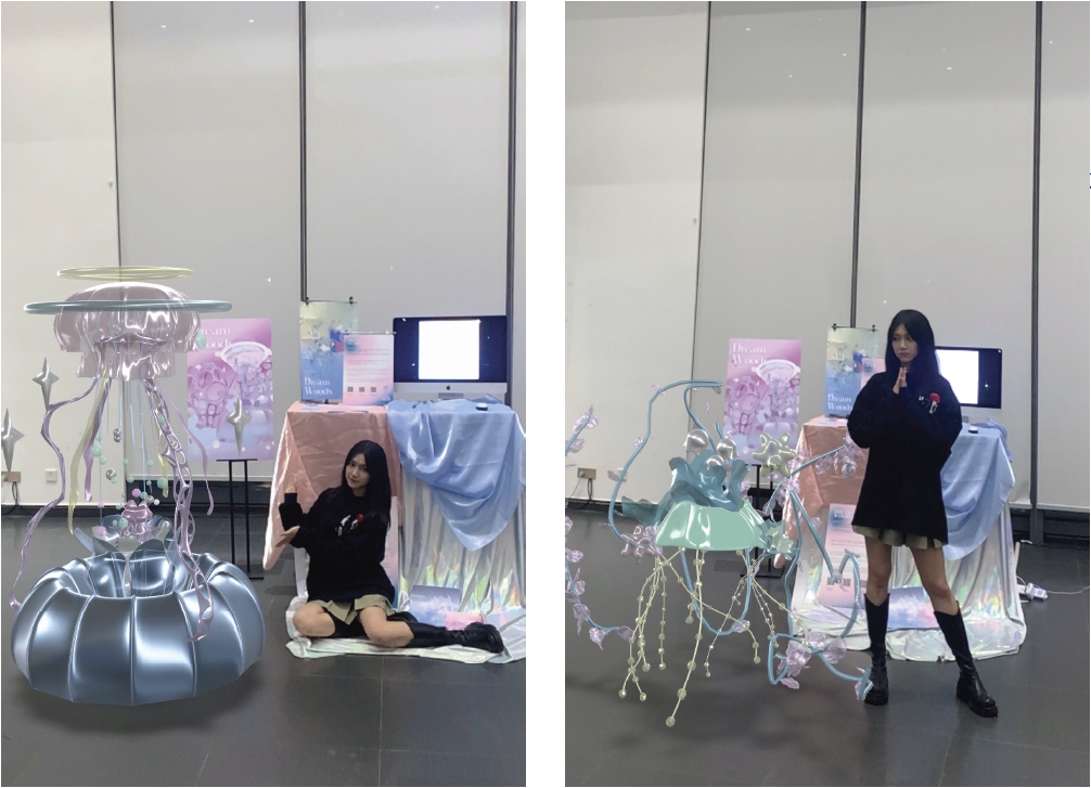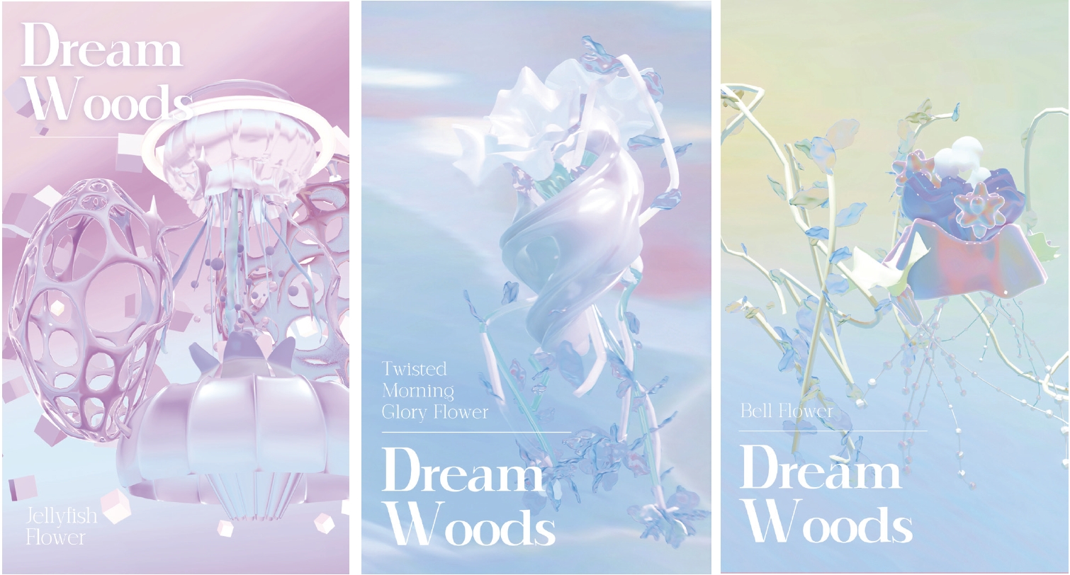 Dreamwoods is an AR art installation, focusing on the phenomenon that young people in nowadays society,who suffer from various mental diseases due to excessive "internal consumption" under the pressure of the fast changing environ-ment. The creators explore that problem from her inner world, and take jellyfish flower, morning glory and bell flower plants as creative prototypes. The project is hoped that the unusual plants in dreams would be used as emotional transmission carriers to give audience the moment of the feelings of the self-healing power in lives.