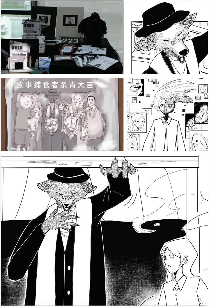 An attempt at black and white comics with a varied style. Tapping into the audience thirst for stories to release stress; the creators' reliance on stories to make a living; like predators seeking their prey. The power of storytelling is not only emotional, relieving, teaching, and comprehending, it is also to inspire more people to get involved in creative activities.