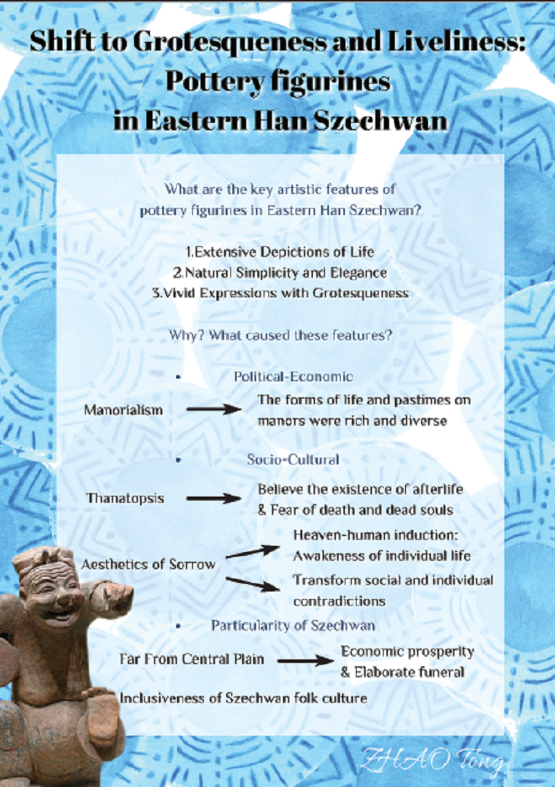 In line with the popularity of the cultural and museum industry in recent years, this article takes the Eastern Han Dynasty Sichuan terracotta figurines as the object of study, striving to firstly outline the artistic characteristics possessed by the Eastern Han Dynasty Sichuan terracotta figurines. Based on the observation method of the online exhibits, the terracotta figurines in Eastern Han period are generally characterized by Extensive Depictions of Life, Natural Simplicity and Elegance, and Vivid Expressions with Grotesqueness. Based on the extensive archival analysis and continuous observation of the exhibits, the article then analyzes the causes of these artistic characteristics from three macroscopic perspectives: political-economic, socio-cultural, and particularity of Sichuan. It is expected to provide a reference for readers interested in Sichuan terracotta art and to provide a new theoretical framework for the study of sculpture.
