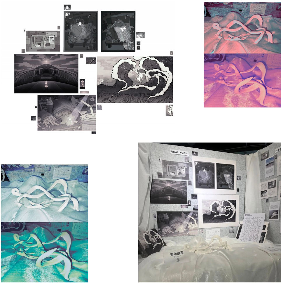 The illustrations depict the various "loneliness" I experienced when I was studying abroad alone and away from my family for the first time.Sculpture works flow. Presents a reflection on how to face loneliness after long periods of solitude. It is the answer I get by seek within myself — the flow.