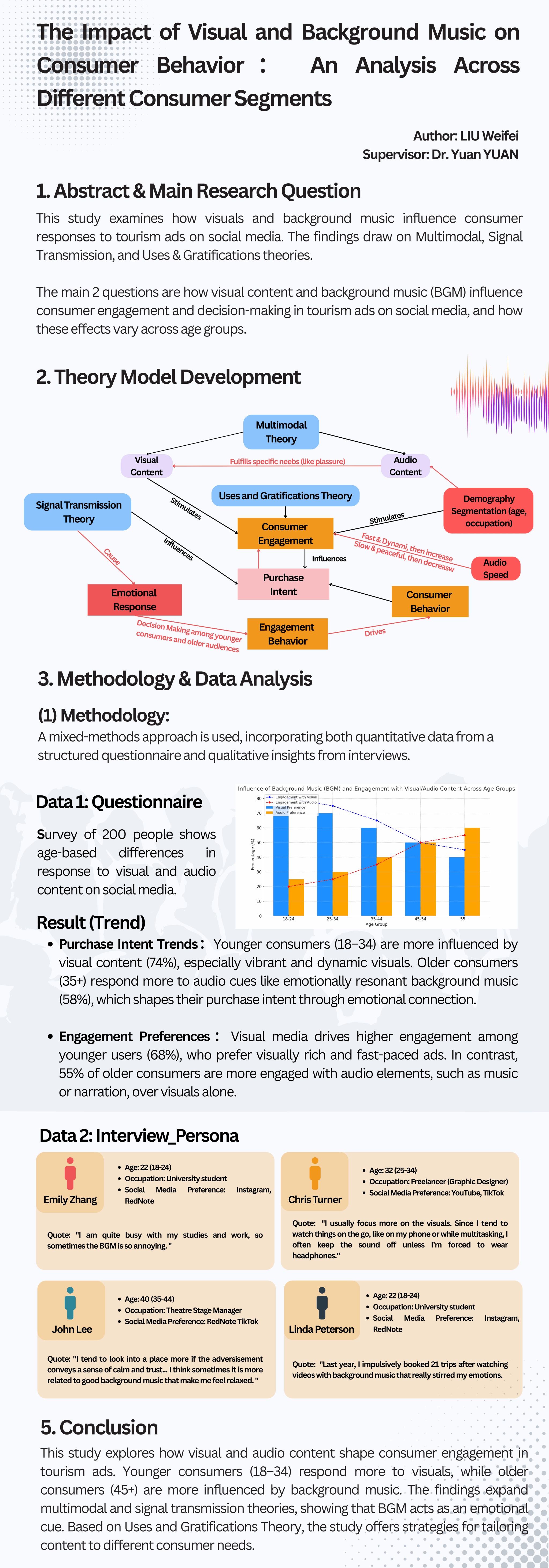 This research explores the impact of visual content and background music in social media advertisements on consumer decision-making, revealing how multimedia content influences engagement and purchase intent across different consumer segments, particularly in the context of tourism product advertising.