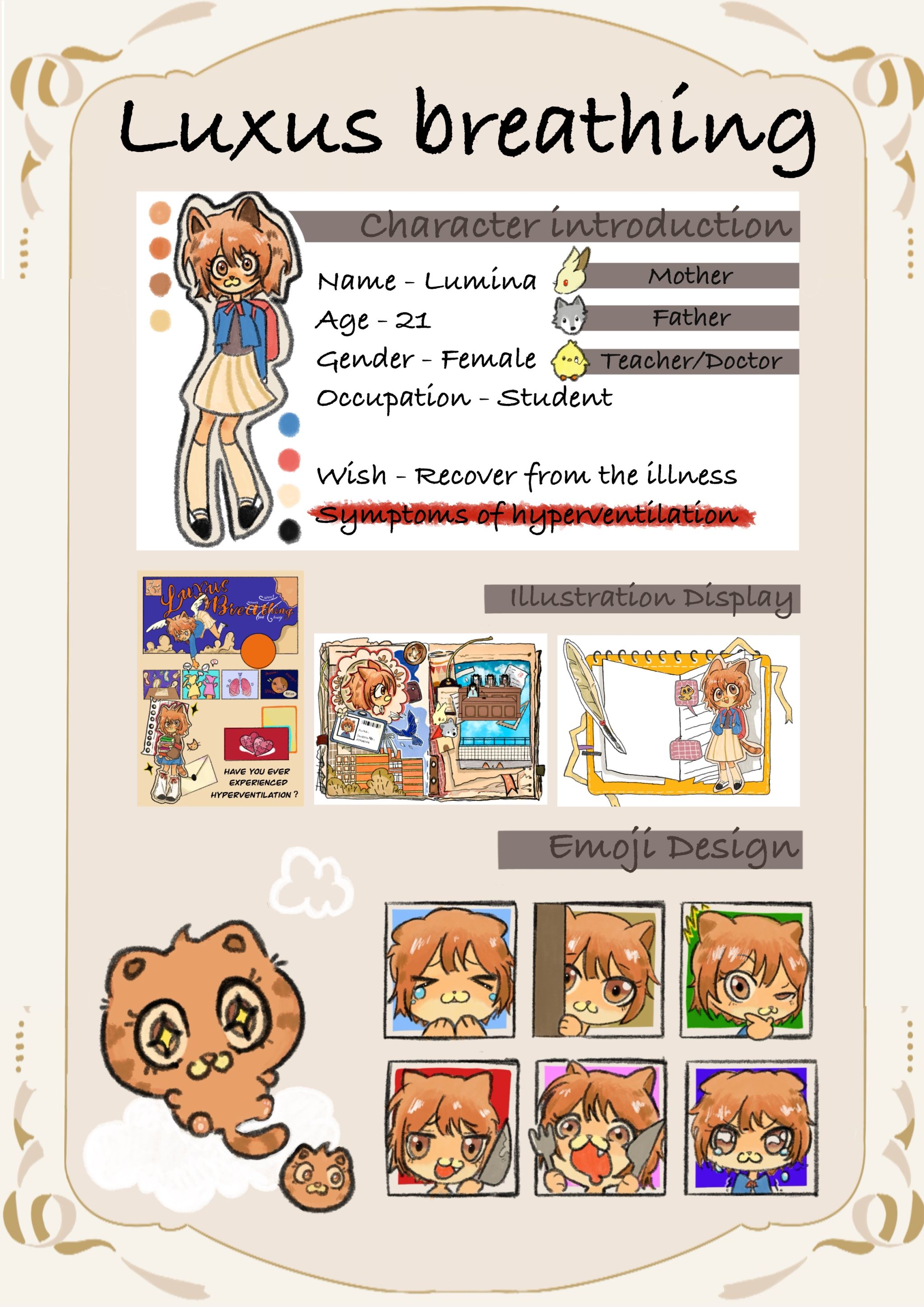 This project focuses on the psychiatric disorder of luxus breathing. The creative inspiration comes from the fact that we have had such a situation ourselves. We hope to explore the causes of luxus breathing through the form of animation and picture books, and find a way to breathe.