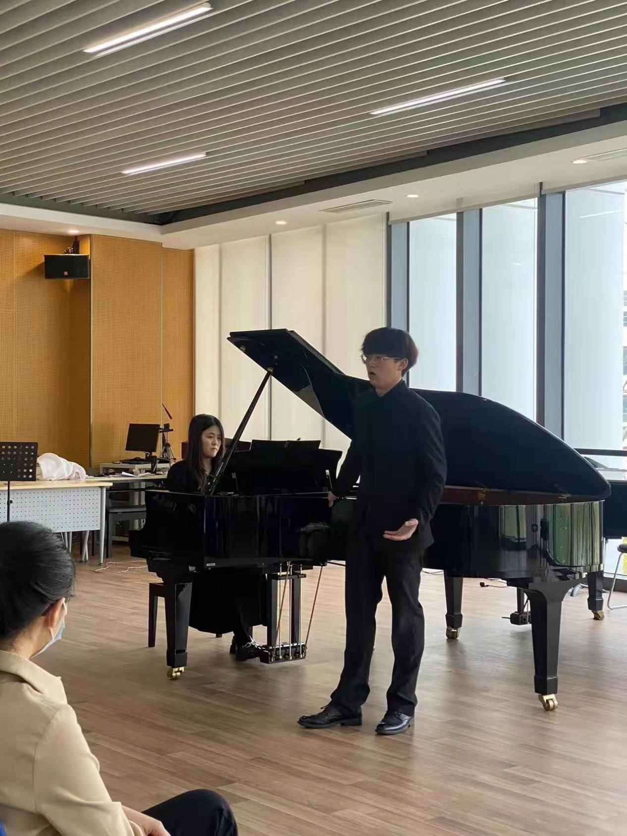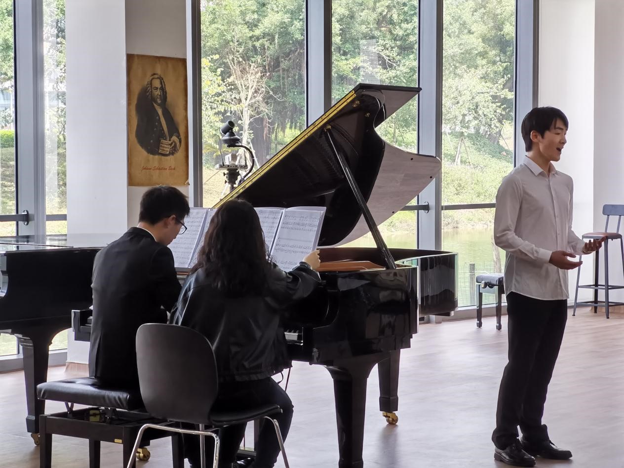 首先是黄天睿演唱,朱滢璇钢琴伴奏的的《钗头凤》,此首乐曲是陆游作词、周易作曲的当代艺术歌曲,也是中国古典诗词改编当代艺术歌曲中的佳作,改编自豪放派词人的婉约作品,具有重要的文学价值和艺术价值。黄同学的演唱气息连贯,吐词清晰,同时也保证了音色的柔和,表现出这首乐曲婉约细致的曲调风格,很好的实现了文曲交融。
