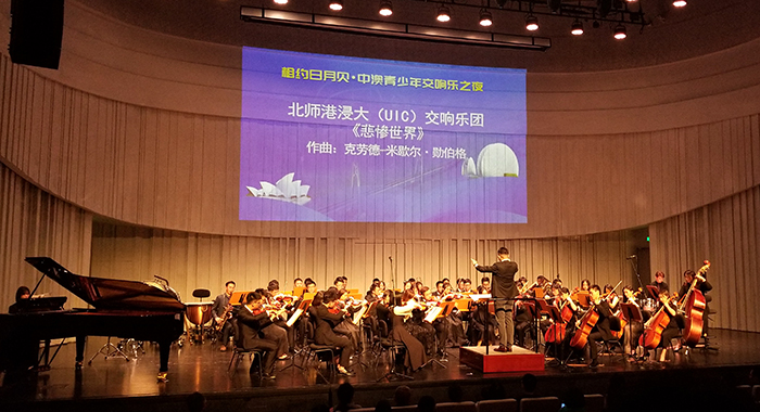 2019年12月21日晚,应澳大利亚新金山交响乐团(ANGO)邀请,北师港浸大(UIC)交响乐团参与了“相约日月贝·中澳青少年交响乐之夜”的音乐演出,与澳洲新金山交响乐团、珠海市第一中学交响乐团一同为市民带来了一场融合中西文化的音乐盛宴。