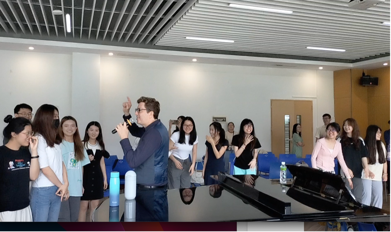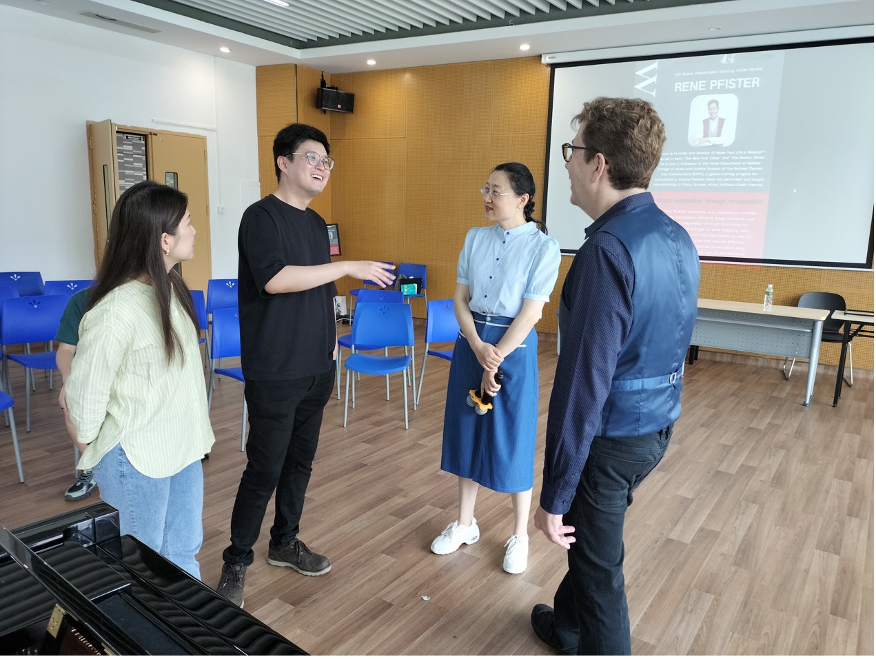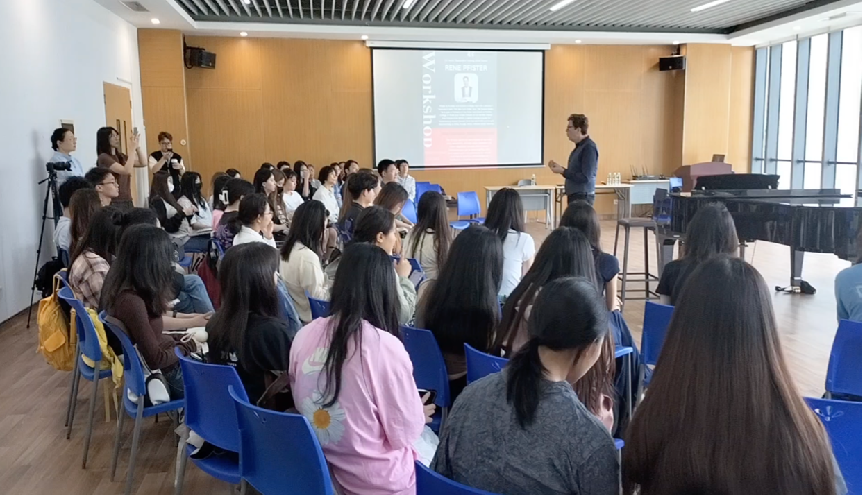 2024年5月8日,由文化创意学院音乐系主办的“让音乐表达乘上想象的翅膀”工作坊在音乐系CC129教学厅进行。来自美国波士顿伯克利音乐学院的瑞尼.斐斯特教授,主持了这场别开生面的音乐工作坊教学活动。有音乐系学生以及来自其他学院的老师学生共60余人参加。此次活动主题新颖、形式活泼,充满创意元素,深受同学欢迎。
