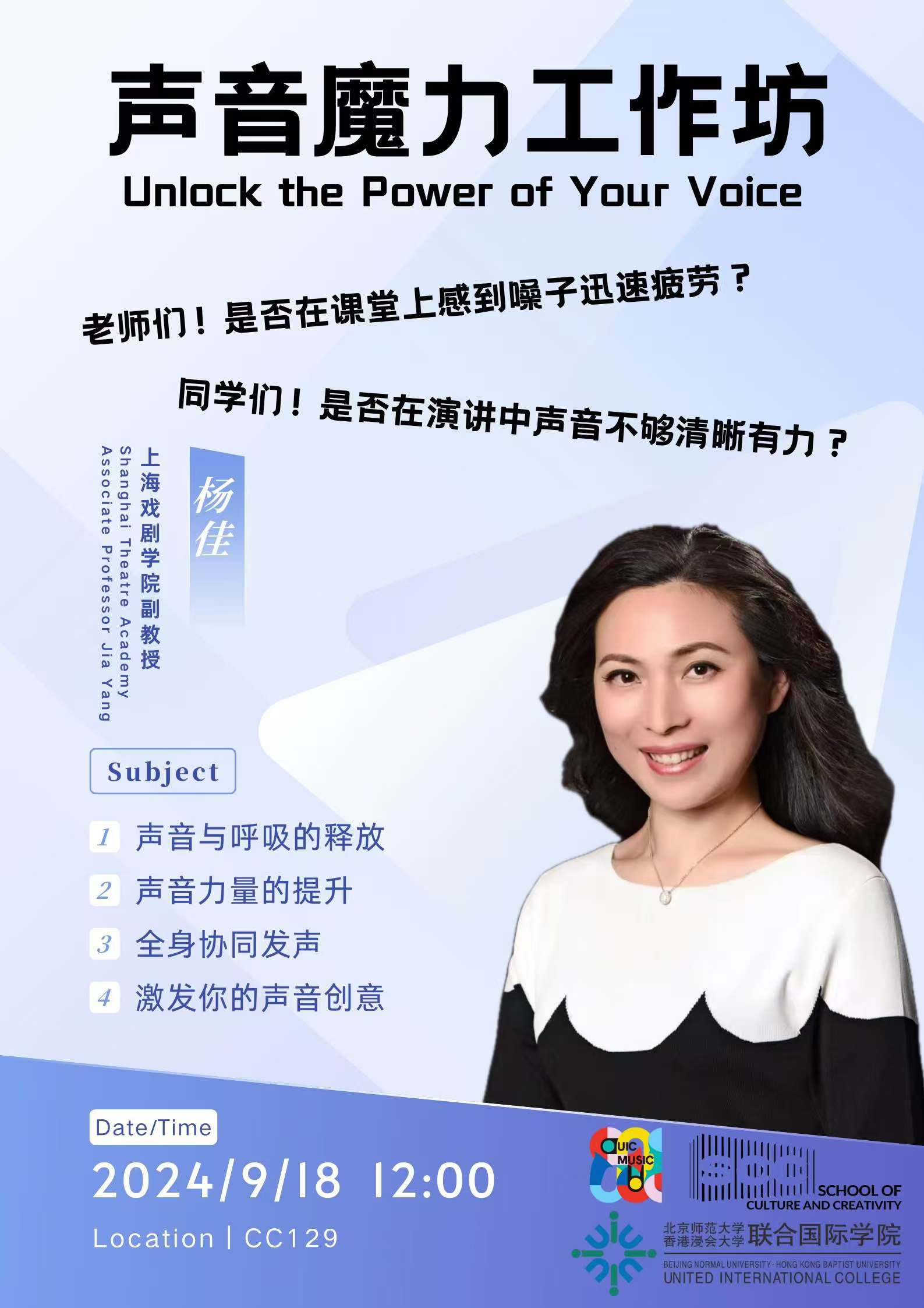 On the afternoon of September 18, 2024, at the special invitation of the Music Department of the School of Culture and Creativity, Associate Professor Yang Jia from the Shanghai Theatre Academy delivered an engaging lecture titled “The Magic of Voice Workshop” at CC129 of the School.