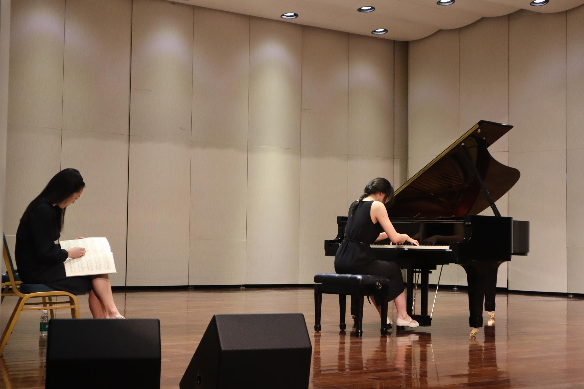 Caption: Dr. Yoonie Han attentively listens to a student’s performance, offering focused and precise guidance.