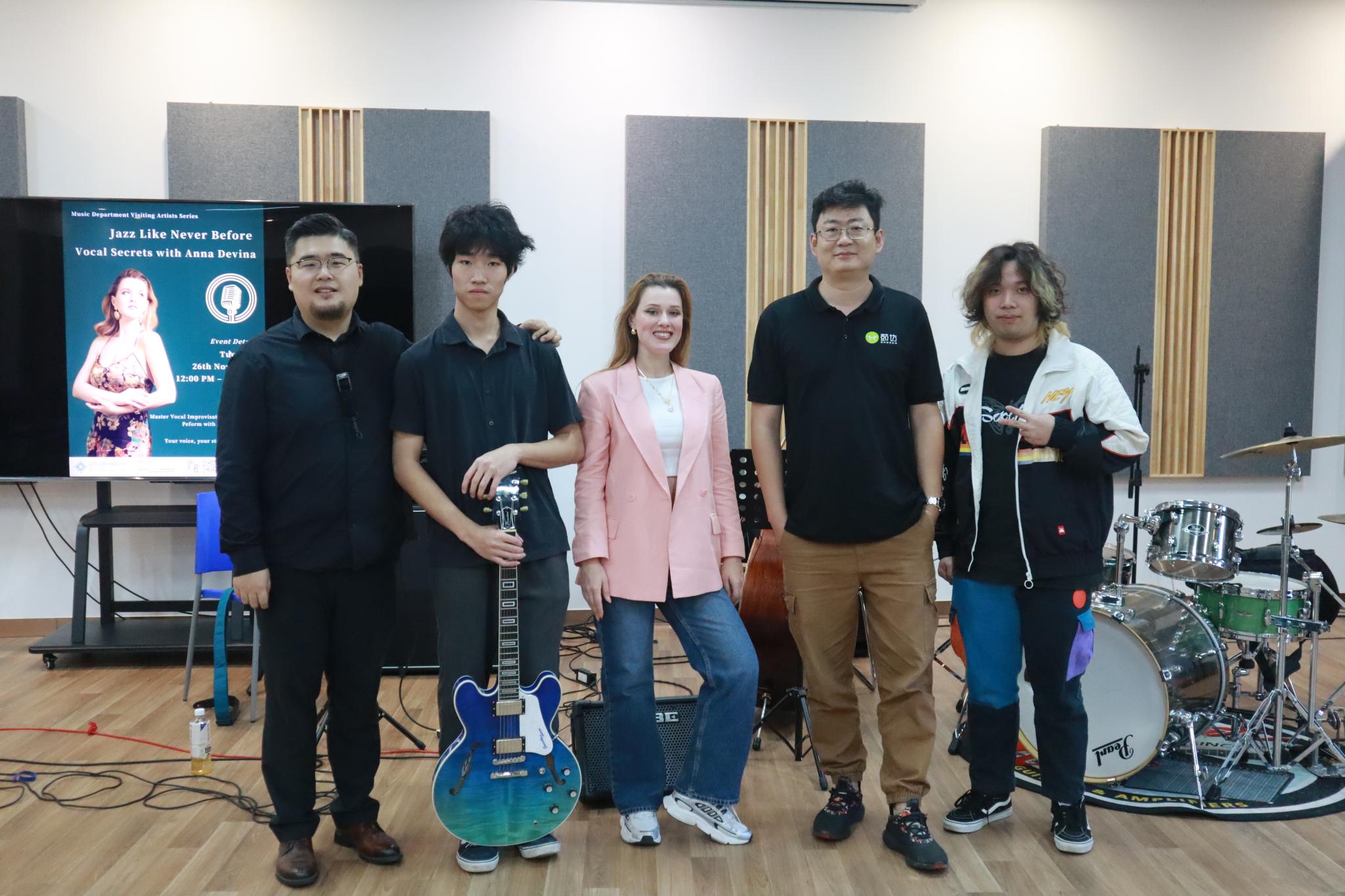 Caption: Anna Devina and the jazz band pose for a group photo after the workshop.