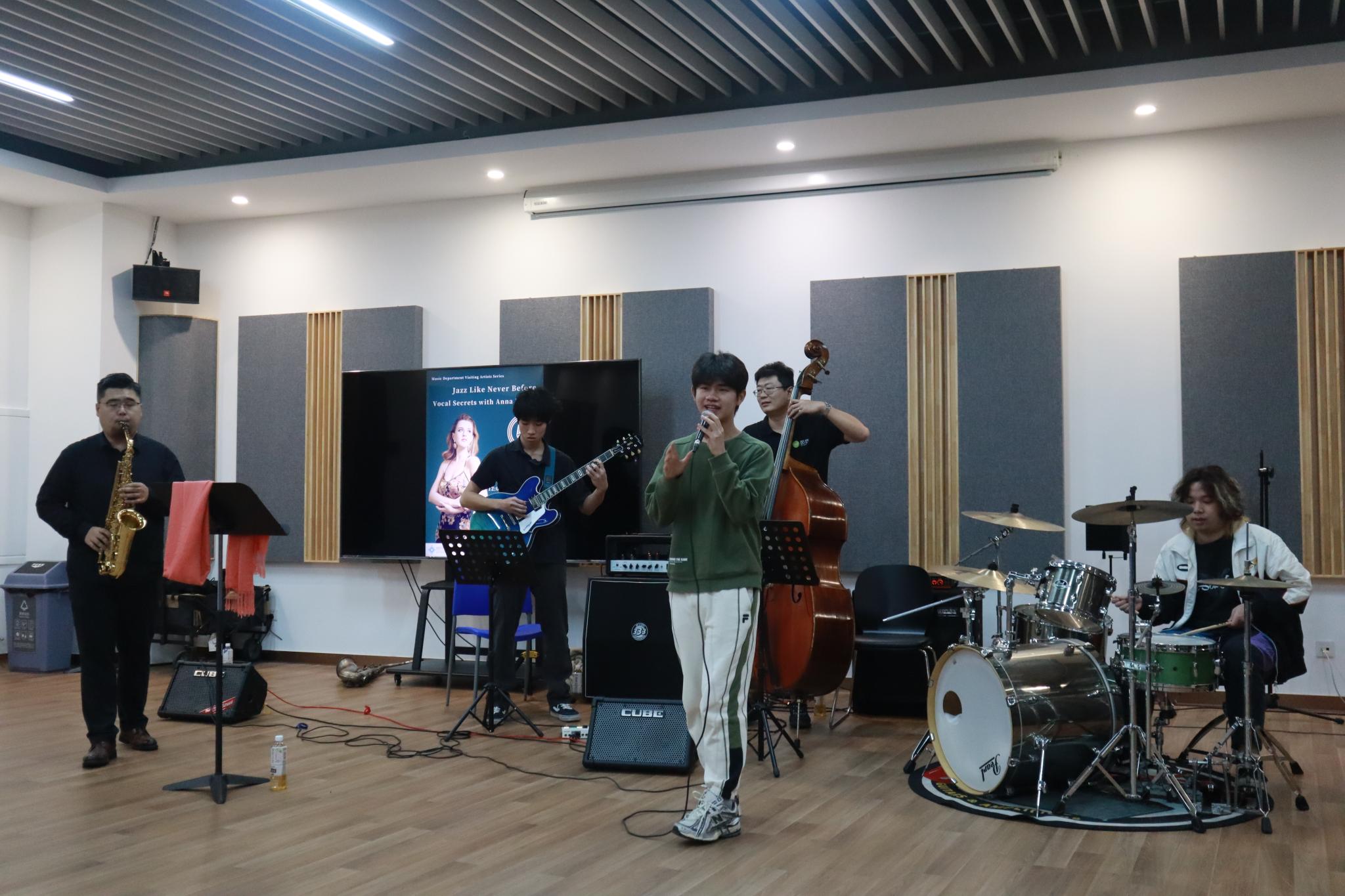 A highlight of the event was Anna's invitation for an audience member to engage in an impromptu vocal improvisation session. With live accompaniment by a jazz band featuring bass, drums, electric guitar, and saxophone, the participant explored melodic improvisation and personal expression. Under Anna’s guidance and encouragement, the individual gained confidence and showcased their unique musical style. This interactive segment brought the workshop to a high point, offering a firsthand appreciation of jazz's flexibility and emotional depth.
