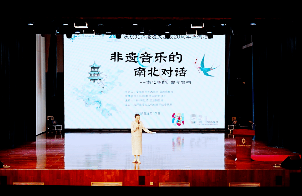 At noon on April 17, 2025, the event “ A Dialogue Between Northern and Southern Intangible Musical Heritage”, part of the BNBU 20th Anniversary Celebration Series, was successfully held at the university’s Performance Theatre. The event was organized by the Music Department, School of Cultural and Creativity. Professor Tian Yali from the School of Arts at Anhui University was invited as the keynote speaker. With her engaging presentation style—interweaving singing and explanation—Professor Tian delivered a rich and distinctive exploration of China’s intangible musical heritage.