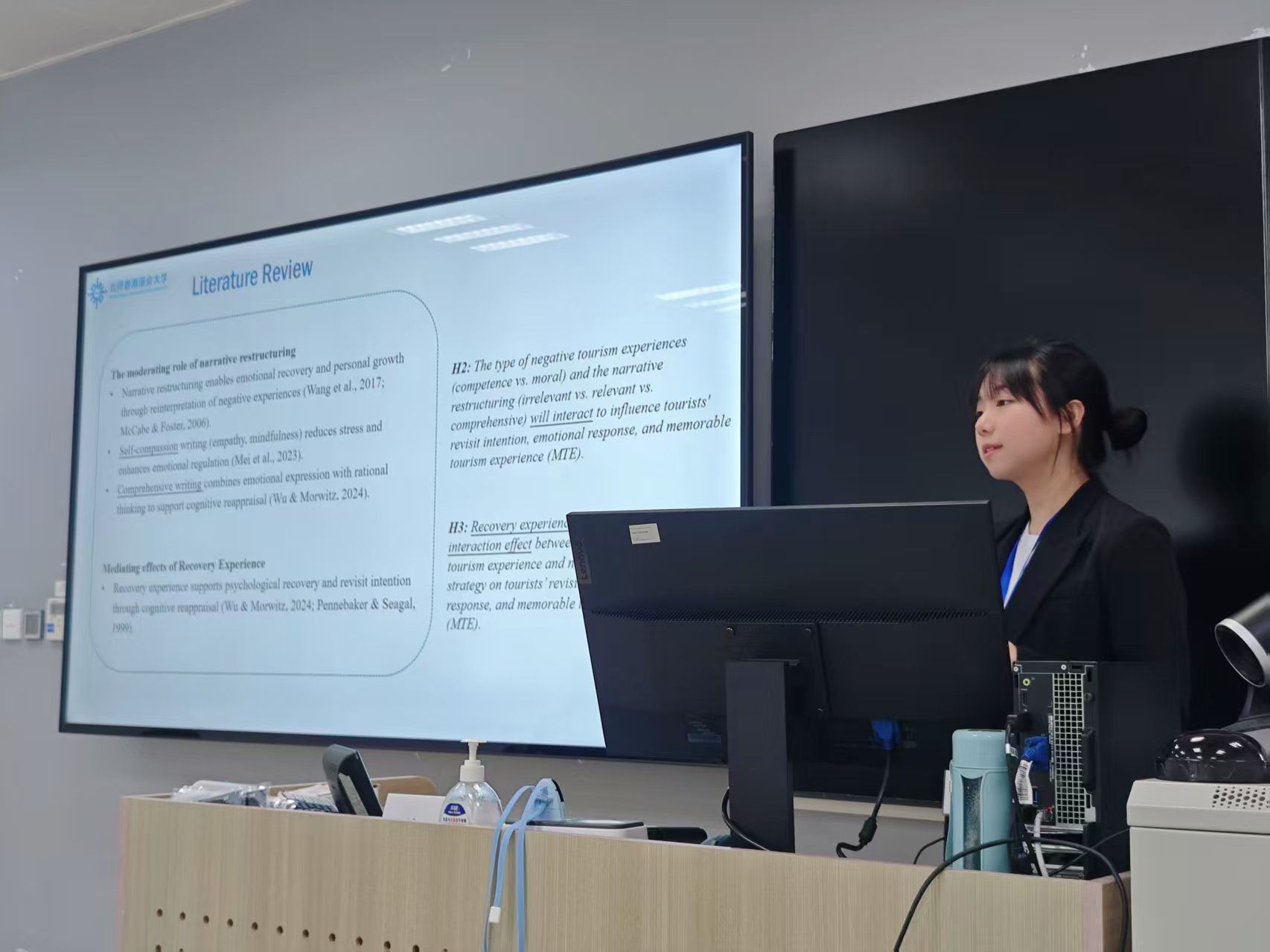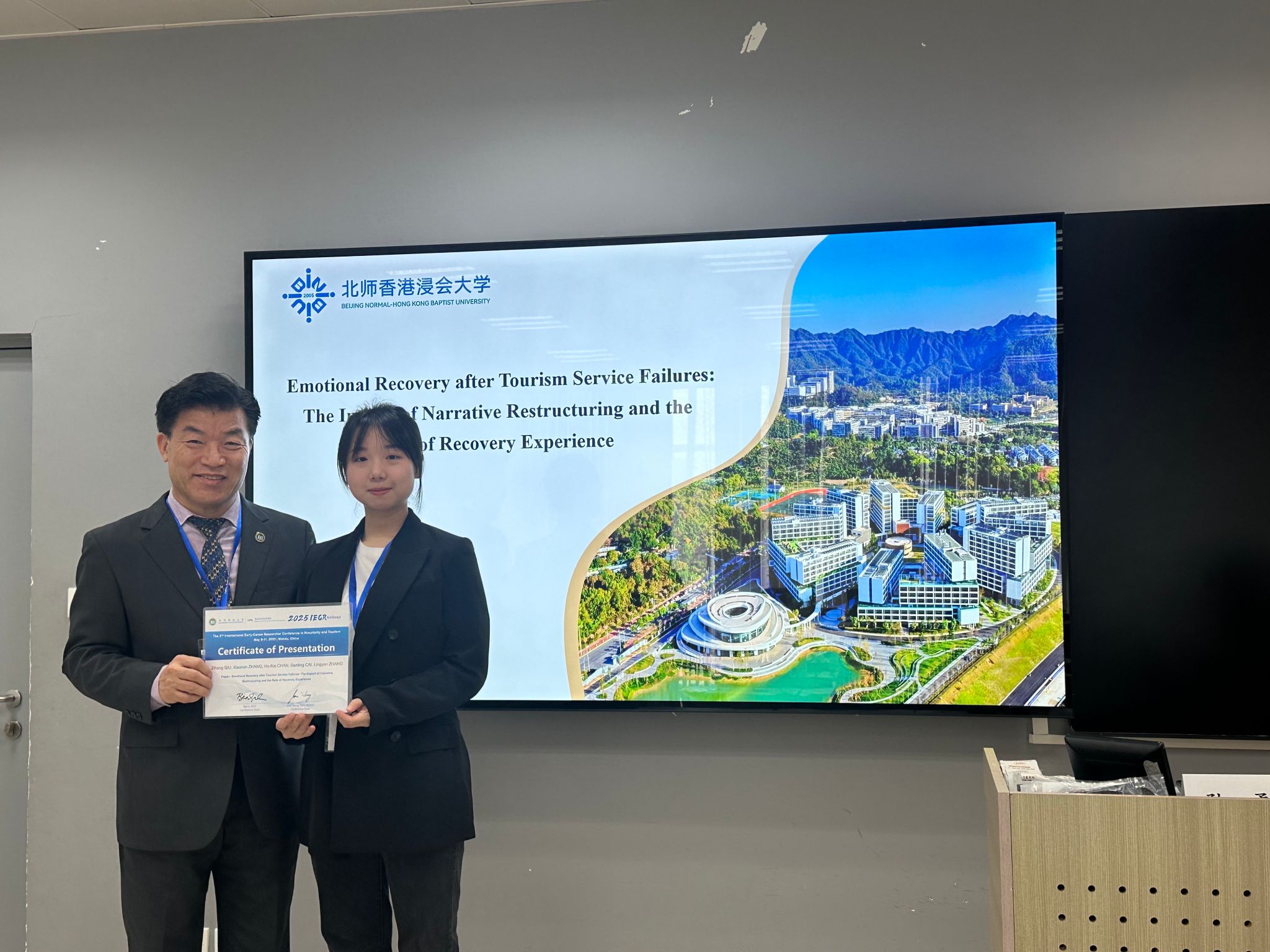 邱梓杭(Zihang Qiu)的论文《Emotional Recovery after Tourism Service Failures: The Impact of Narrative Restructuring and the Role of Recovery Experience》探讨了游客遭遇旅游服务失败后,如何通过不同叙事策略实现情感恢复,并揭示'恢复体验'在行为意向与情绪反应中的关键中介作用。该研究为旅游企业提供了针对不同服务失败的分级应对策略,其创新性受到与会专家认可,展现了BNBU学子的学术研究能力与国际视野。