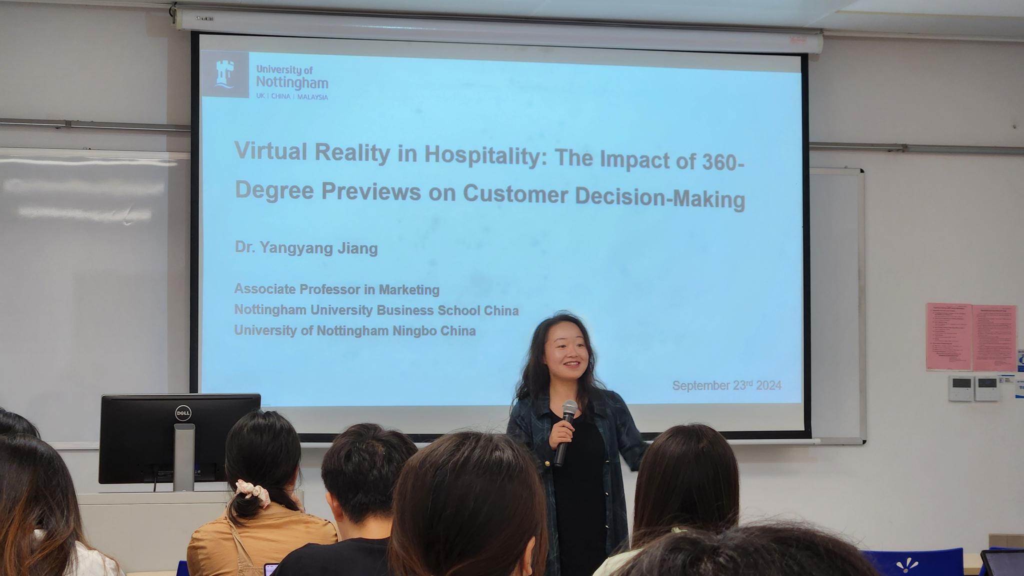 2024923日下午,文化与创意学院文化与创意设计系旅游、酒店与会展管理专业邀请宁波诺丁汉大学的蒋阳阳副教授,在CC-302教室举行了一场名为"酒店业中的虚拟现实:360度预览对消费者决策的影响"的精彩讲座。
